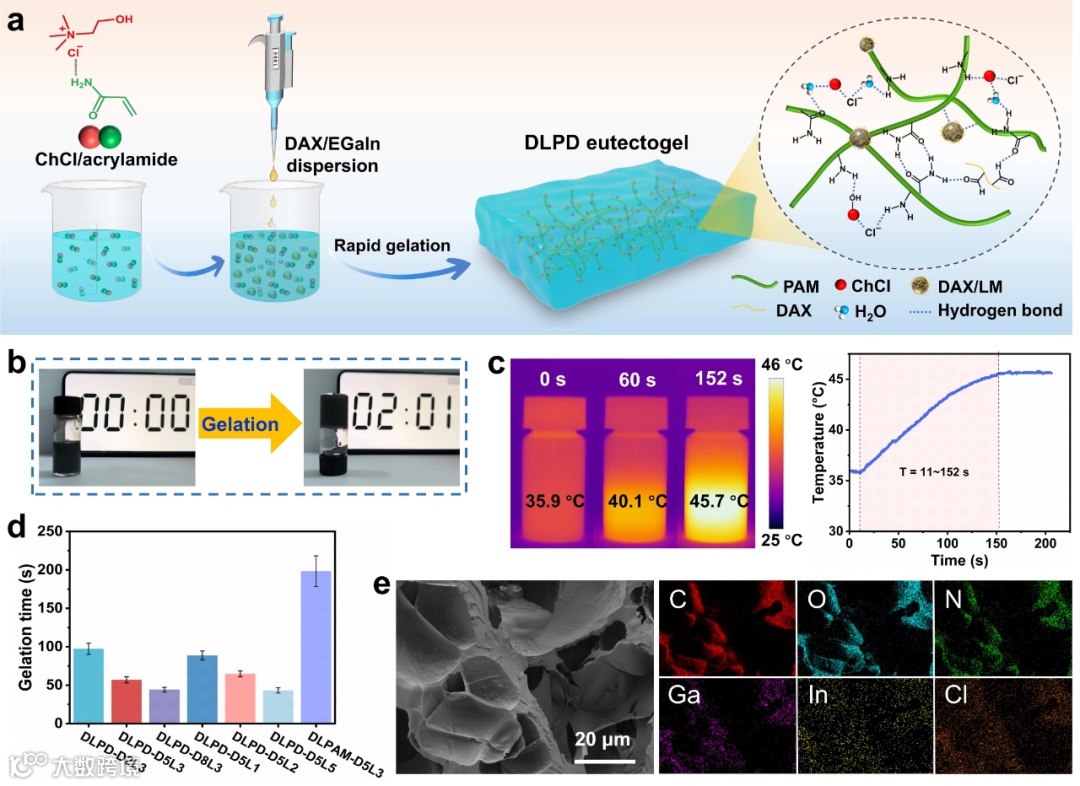 低共熔凝胶(Eutectogel)因其固有的导电性、优异的力学性能和环境稳定性,近年来在柔性电子应用领域广受关注。然而,传统的低共熔凝胶制备仍高度依赖化学引发剂、交联剂和高能紫外光辐照,制备过程复杂且导致材料生物相容性降低。因此,开发一种简单、绿色和快速的低共熔凝胶制备方法是当前亟需解决的关键问题。