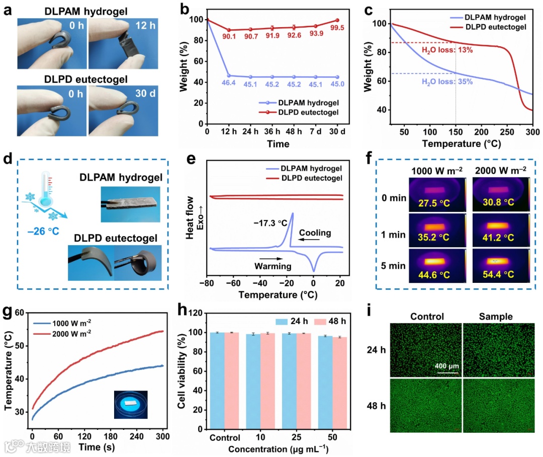 图4 DLPD低共熔凝胶的抗失水、抗冻、光热特性及生物相容性