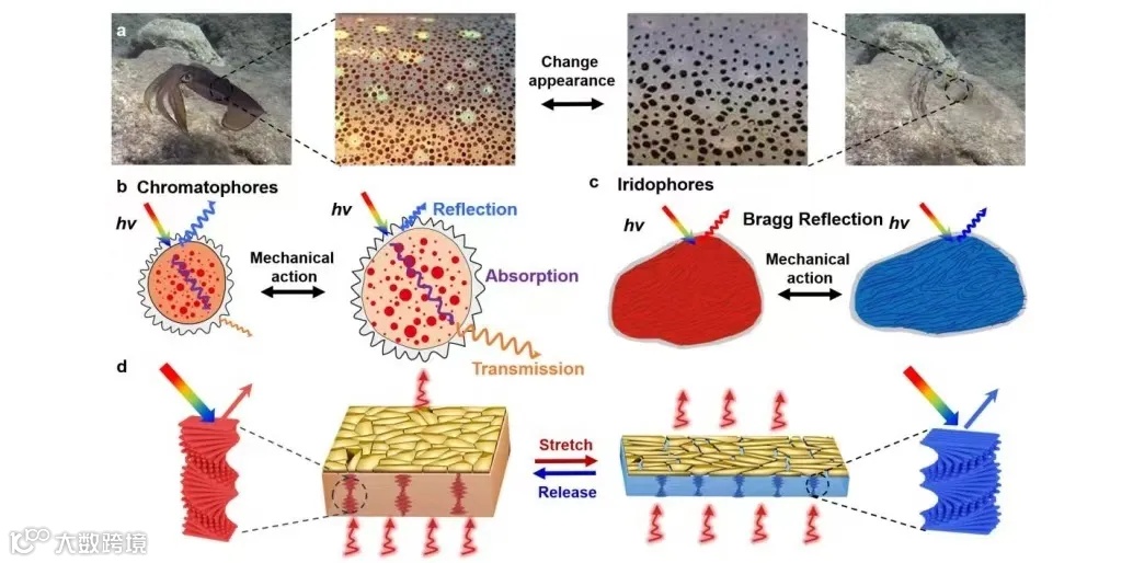 图1. 头足类生物启发的力致变色动态多波段伪装液晶智能材料设计思路