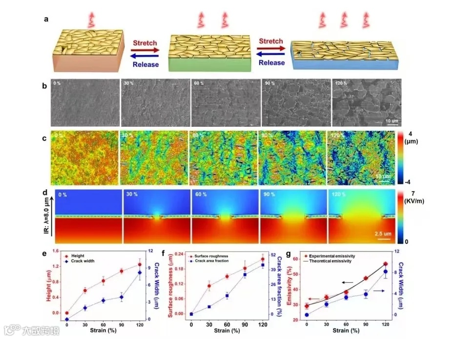 图3. 单轴力致拉伸对MXene-CLCEs薄膜的光学、红外和电磁性能影响规律