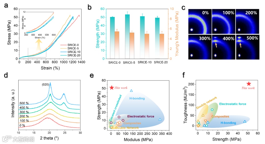 为了研究SRICE的机械性能,在图3a中展示了SRICE的典型工程应力-应变曲线,图3b中详细列出了相应的强度和杨氏模量。值得注意的是,所有SRICE均表现出相似的机械行为(图3a),尤其是在初始变形阶段,杨氏模量随离子液体含量的变化仅有略微下降。当应变超过400%时,所有SRICE均出现明显的应变硬化行为。原位广角X射线散射(WAXS)证实,应变强化源于PTMEG的应变诱导结晶,与PTMEG的(020)晶面对应的衍射峰的出现支持了这一结论(图3c-d)。其卓越的韧性超过了大多数已报道的离子导电弹性体(图3e-f)。