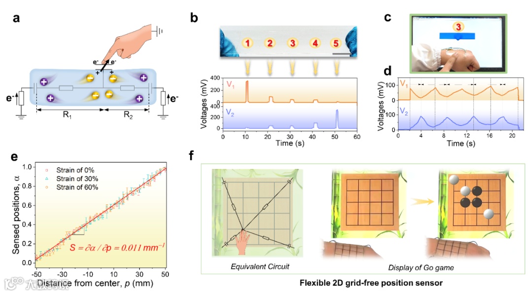因此,SRICE-10 可直接用作无栅格位置识别传感器(图 5a)。SRICE-10 的内部元件可视为从触摸位置到两端的两个电阻。两侧的感应电压与电阻成反比,这些电信号可以转换为位置坐标。感应电压与触摸位置到两端的距离成反比。例如,触摸 1# 位置时,V1 > V2;相反,触摸另一端时,V1 < V2。触摸 3# 位置时,V1 和 V2 的值相近,表明识别到了 SRICE-10 条带的中心(图 5c)。图 5d 展示了在条带上从左到右或从右到左连续移动时 V1 和 V2 的变化。随着 V2 的增加,V1 逐渐减小,这表明从左向右滑动,反之亦然。因此,如图 5d 所示,通过两电压比值的变化,可以直观地反映触摸位置。此外,由于 SRICE-10 具有良好的拉伸性,它甚至可以在拉伸后识别位置。施加 30% 和 60% 的拉伸后,显示出与未拉伸试样相似的灵敏度(图 5e),证实了基于三阻触控传感技术的无栅格位置识别传感器不受变形影响。如图 5f 所示,5×5 的网格仅作为参考绘制在底板上,网格本身没有相互连接的电极,但仍能在一盘完整的围棋比赛中准确确定棋子的位置。显然,这些柔软、坚韧、有弹性且反应灵敏的离子导电弹性体的开发为人机交互技术的进步带来了曙光。