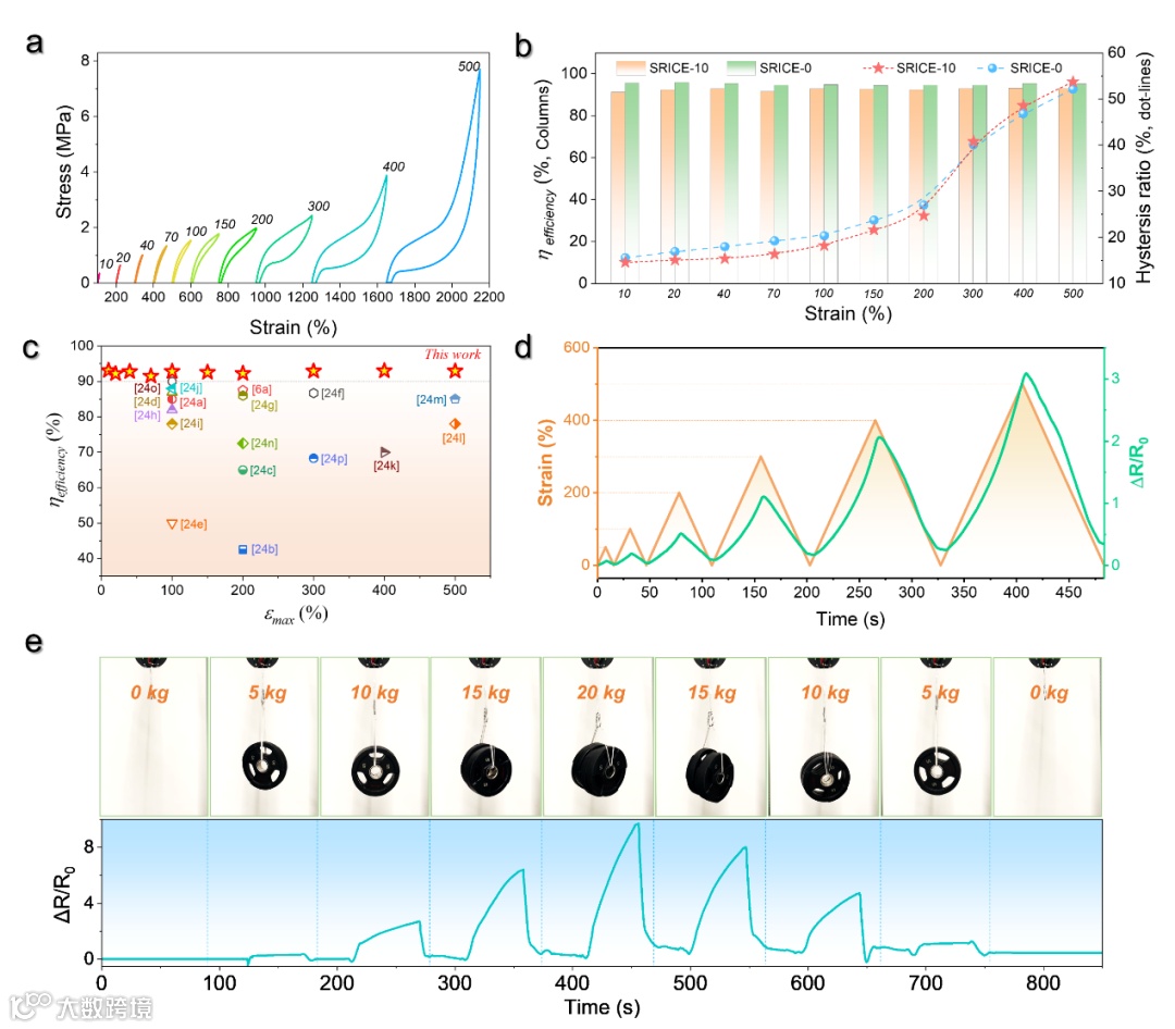 在柔性传感器中,灵敏度是一个关键指标。图4a展示了SRICE-10的循环应力-应变曲线。图4b显示了SRICE-0和SRICE-10的η恢复和滞后比。可以明显看出,SRICE-10和SRICE-0在η恢复和滞后比方面表现出相似的趋势。随着最大应变(εmax)的增大,滞后比也增加,这是因为SRICE-0和SRICE-10中的硬段相具有相似的堆积结构。值得注意的是,如图4c所示,SRICE-10的η恢复值超过了大多数文献报道的弹性体性能。据作者所知,51.0MPa的强度和92.9%的回弹效率是超分子离子导电弹性体中同时达到的最高纪录。如图4d所示,通过监测循环拉伸过程中的电阻变化(ΔR/R0),进一步证明了这种材料具有出色的弹性表现。此外,图4e显示了SRICE-10在承受不同重量哑铃负载时产生的相应ΔR/R0值。这表明该材料在应变和ΔR/R0电阻传感恢复能力方面表现出极强的重复加载循环能力。因此,SRICE具有无色透明、适当模量、出色强度、韧性和灵敏的应变电阻响应,在高性能柔性传感器中,SRICE展现出良好的应用潜力。