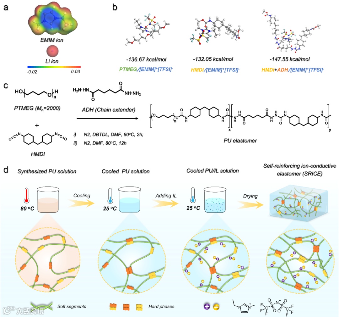 中国科学院宁波材料技术与工程研究所陈海明副研究员和茅东升研究员团队基于微相锁定策略设计了一种自增强离子导电弹性体(SRICE),以满足对先进性能的要求。为了增强软段与离子之间的相互作用,选择了大体积且与软段结合能力强的离子液体1-乙基-3-甲基咪唑啉双(三氟甲基磺酰基)亚胺([EMIM]+[TFSI]-),确保其有效留存在软段中。此外,采用了能够发生应变诱导结晶的聚四氢呋喃(PTMEG)和结构规整的4,4'-二异氰酸酯二环己基甲烷(HMDI),通过应变诱导结晶实现自增强。规则结构的己二酸二肼(ADH)作为扩链剂,进一步增强了硬段之间的结合力。通过将合成的聚氨酯(PU)溶液从80℃冷却至25℃的优先组装策略(PAS),促进硬段氢键的形成,优化微相分离结构,确保后续引入的离子被锁定在软相中。所制备的SRICE呈现出软/硬双相分离的微观结构。