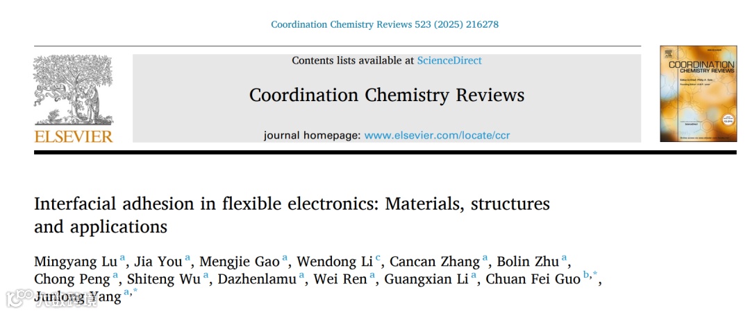 为深入探讨柔性电子领域中界面粘附技术的重要性和最新发展,近期,四川大学李光宪教授/杨俊龙副研究员与南方科技大学郭传飞教授合作在Elsevier旗下《Coordination Chemistry Reviews》期刊上发表了题为《柔性电子的界面粘附:材料、结构与应用》(Interfacial Adhesion in Flexible Electronics: Materials, Structures, and Applications)的综述论文。聚焦于柔性电子领域中的粘附界面,该综述详细探讨了这些粘附技术的基本原理和构建方法。还重点介绍了不同类型粘附技术在表皮电子、植入式设备和机器人领域中应用的最新进展。最后,文章展望了粘附技术未来的发展,分析了其面临的持续挑战,目标为高耐久柔性电子的概念化和制造提供参考。