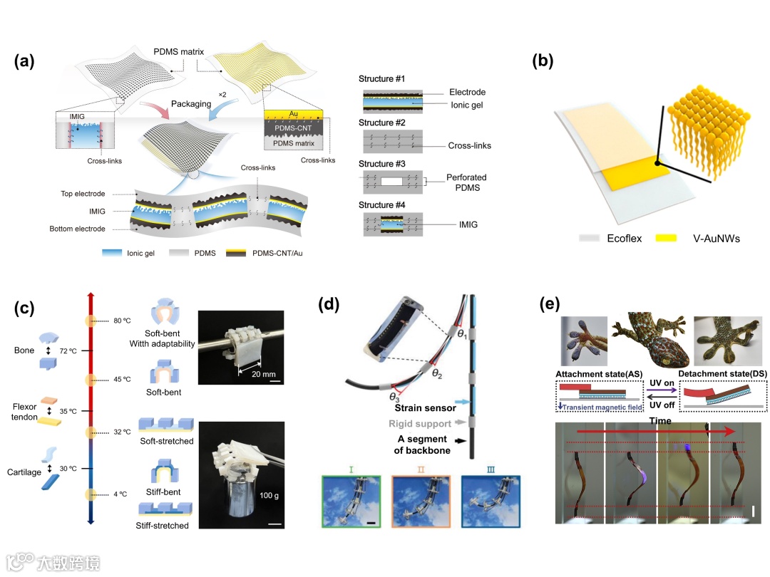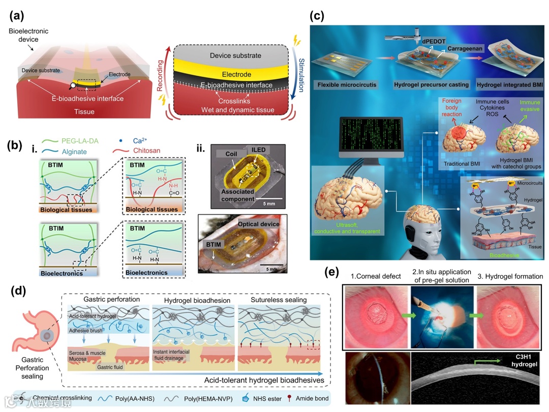 柔性电子具有轻薄、高适应性、多功能性和便携性等特点,在生物医学、健康监测和智能机器人领域发挥重要作用。然而,柔性电子的功能源于多层组件集成,不同材料的基底、电极和功能层间普遍存在不兼容性和机械不匹配问题,形成复杂的界面。此外,柔性电子的应用通常与人类活动相关,使用场景复杂,因此其多层结构在动态环境下的稳定服役成为了关键技术挑战。通过一体化的界面粘附设计,可以有效改善柔性电子长期运行过程中的分层失效问题,并赋予其特殊功能。这类粘附界面基于材料分子间相互作用和结构设计实现,在解决器件稳定性问题方面具有巨大潜力。然而,该领域的早期研究对此关注有限。