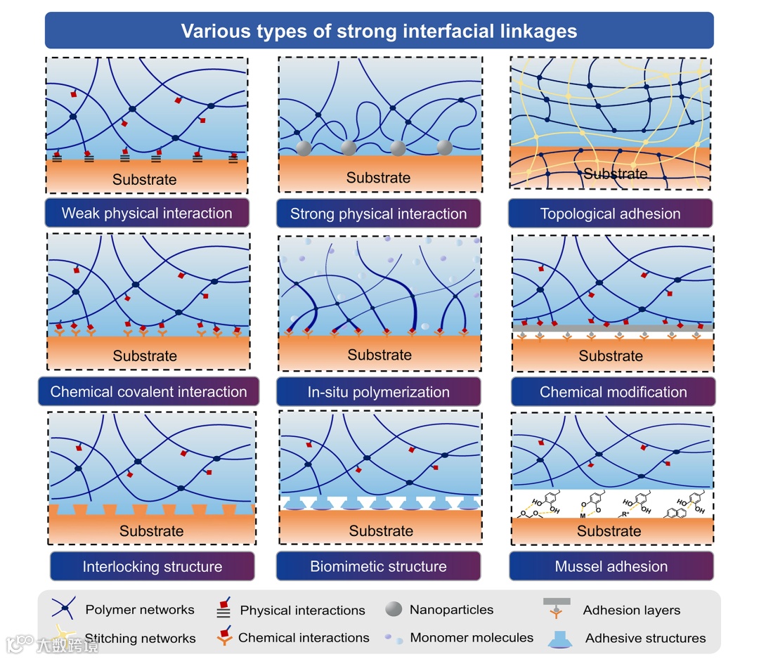 在粘附机理方面,文章基于材料分子间相互作用类型,从柔性电子稳定性的角度出发,对粘附技术分类并进行了全面的概述。包括弱物理相互作用(如氢键、静电相互作用、金属配位、疏水相互作用等)、强物理相互作用(如结晶域、添加纳米粒子、形成缠结网络)、化学共价键和粘附结构设计等策略。旨在阐明不同类型粘附界面间的关系、技术特点和优势。