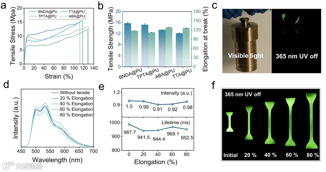 此外,该系列薄膜表现出优异的机械性能,其断裂伸长率约为120%,能够提取2.6kg的反应釜,最重要的是在拉伸过程中薄膜的磷光性能基本不发生改变,显示了其在大面积显示、柔性穿戴领域的潜在应用(图4)。