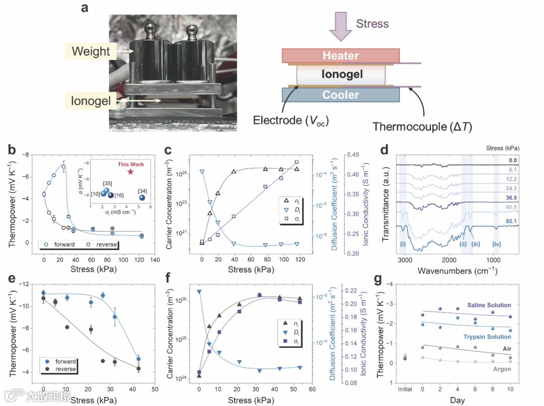 团队发现,在静态应力下,压电内电场增强了离子分化,有效离子浓度显著提高,同时由于离子间作用力增强,扩散系数随之降低。这种离子输运行为的变化导致离子热电势和电导率发生显著变化。当压电内电场与温度梯度同向时,n-型热电势从–4.4 提升至最高–6.9 mV K–1;反向时则呈现相反趋势,与上述预测吻合。通过掺杂离子凝胶的离子热电–压电效应研究和压力下的红外透射光谱进一步验证了这一机制。值得注意的是,该材料在不同环境中都展现出良好的热电性能稳定性,尤其是在水溶液环境中,热电势可达干燥状态的约10倍,充分印证了其对环境湿度的敏感性。