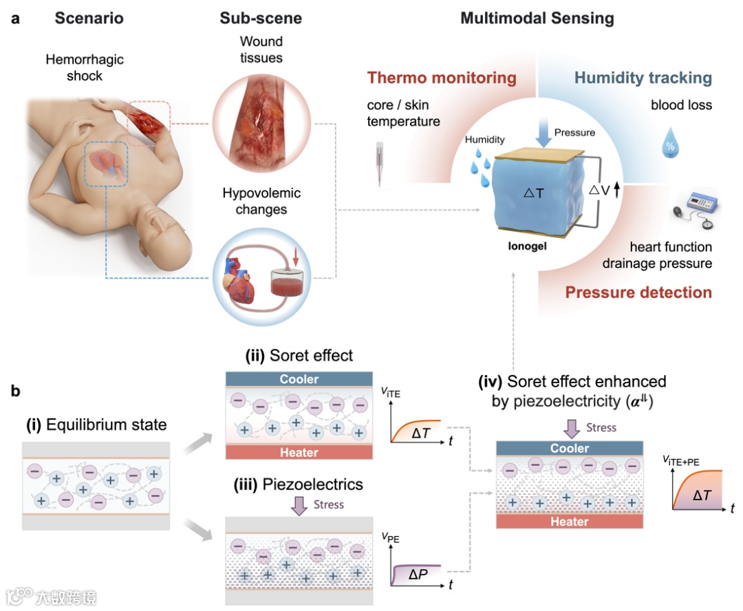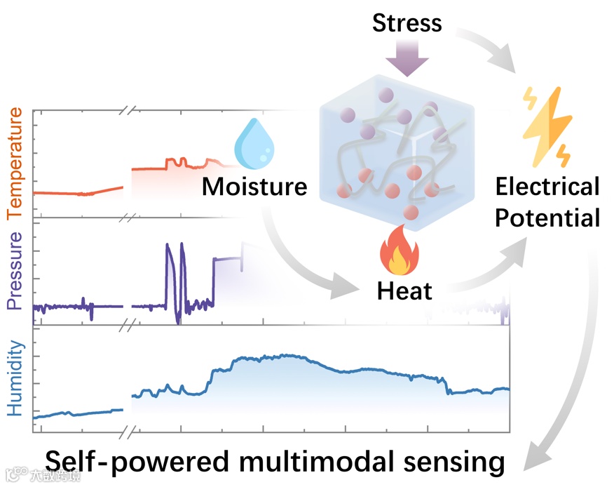 该材料的双模态特性源于离子液体在温度梯度下产生的离子热电效应,以及PVDF基骨架的压电效应。当温度梯度与压力场同向建立时,不仅两种效应本身会产生电压,压电产生的内电场还进一步促进阴、阳离子的分化,使离子热电势呈现"1+1>2"的协同增强效应。此外,凝胶中水的存在显著增强离子输运,导致离子热电势受环境湿度影响,湿度越高,热电势越强。这种单一离子凝胶对温度、压力和湿度等环境参数的多维响应,恰好契合临床对多参数生命体征的传感需求,尤其在创伤休克等紧急医疗场景中尤为关键。