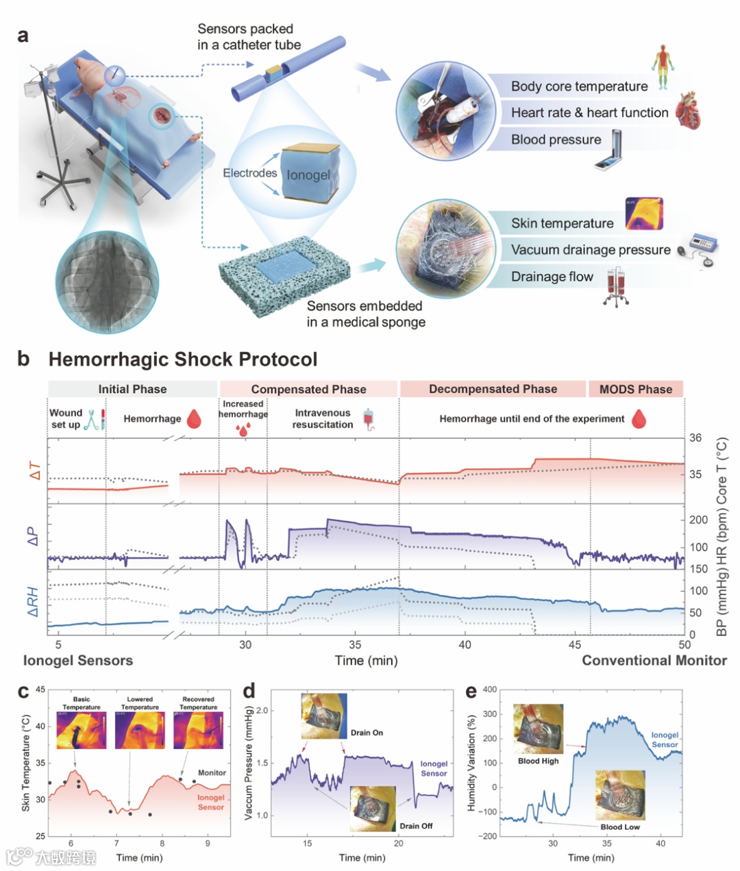 3)临床医疗场景的应用:通过在大型动物(猪)出血性休克模型中进行凝胶传感器的实验,成功展示了离子凝胶对多个生命体征(如血压、心率、体表温度、核心体温及血液流失量)的实时精确检测能力,充分验证了其在医疗传感领域的巨大潜力。