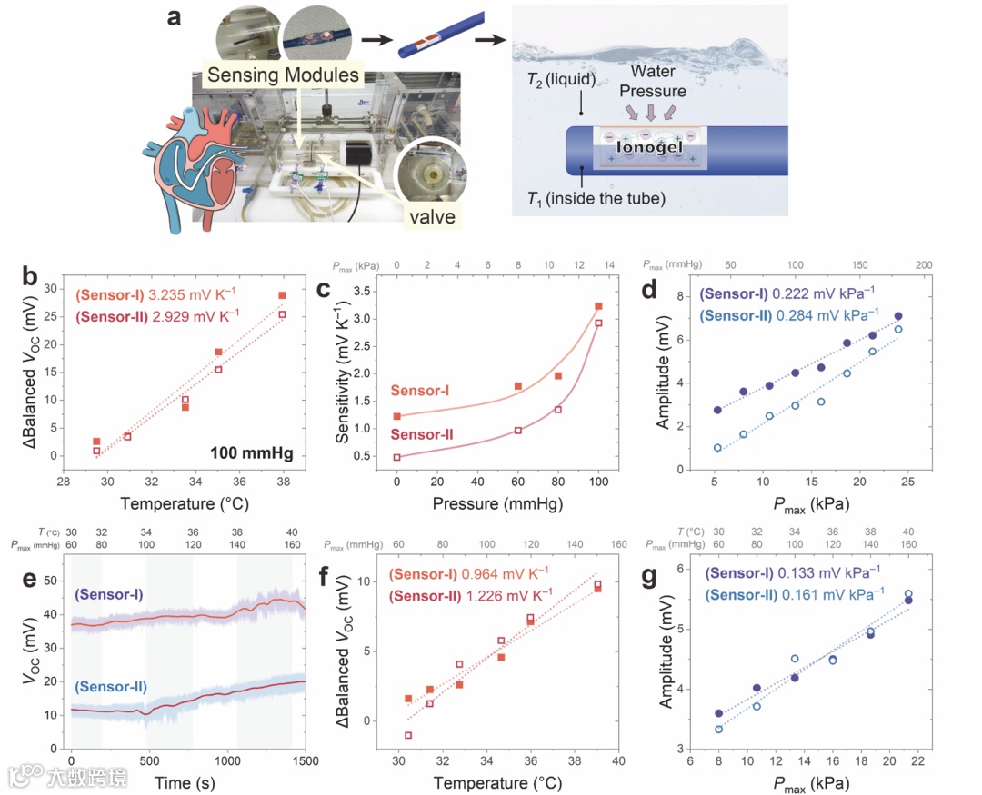 基于材料的温度–压力双参数灵敏特性,团队设计了一种以动脉导管为载体的离子凝胶传感器。器件结构简单:将离子凝胶夹在两片电极之间并连接导线,嵌入动脉导管的小孔,再用硅胶填充缝隙。体外模拟测试在心脏环境模拟系统中进行,通过外部电压表检测信号。信号可分为两部分:随人工瓣膜运作的周期性电压振幅(压力信号)和波动平衡值的变化(温度响应)。与系统原有传感器对比,离子凝胶传感器在30–40 ℃温度和60–160 mmHg压力范围内均呈现出优异的线性响应,最低灵敏度可达0.964 mV K–1和0.133 mV kPa–1。此外,压力越大,温度灵敏度越高的特性进一步验证了前述研究发现。