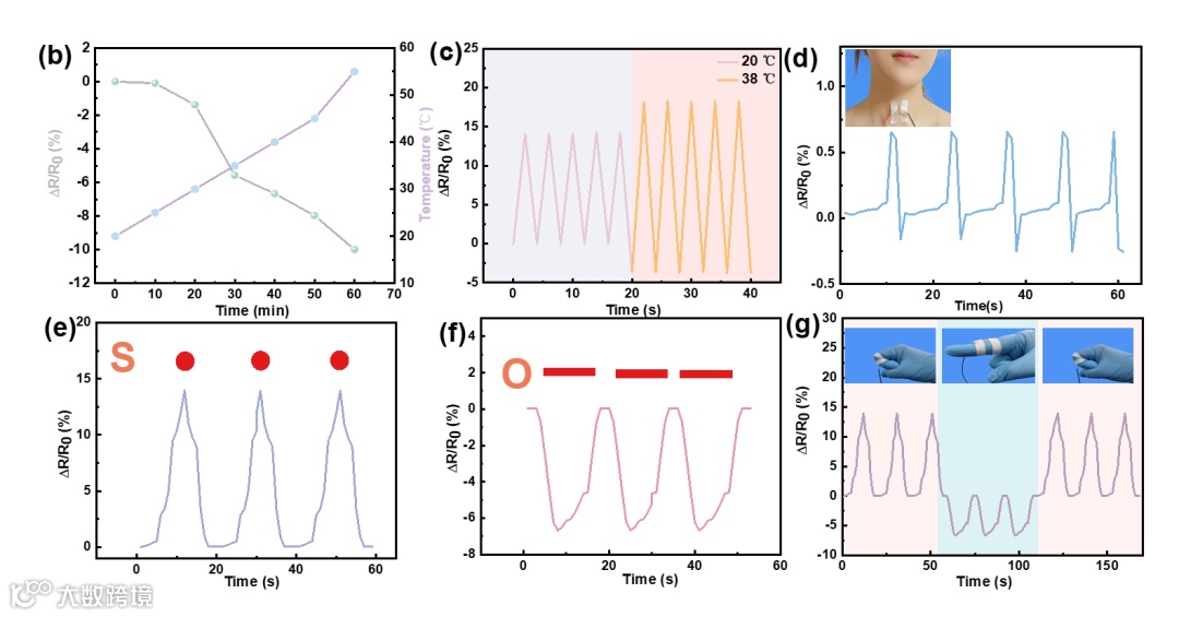 研究表明通过观察水凝胶的GF值变化,可评估其应变传感性能。在0-400%应变范围内GF的值约为0.58,超过400%后急剧上升至8.76。并且水凝胶在不同应变下具有可重复且稳定的电信号。在肘部、手腕和手指的弯曲监测中,传感器展现出卓越的可重复性和稳定性。同时,水凝胶的温度敏感性使其成为医疗传感器的理想选择。在生物传感方面,模拟了发热状态下的传感应用和老年病人的辅助识别需求,展现出其在智能医疗领域的潜在应用价值。