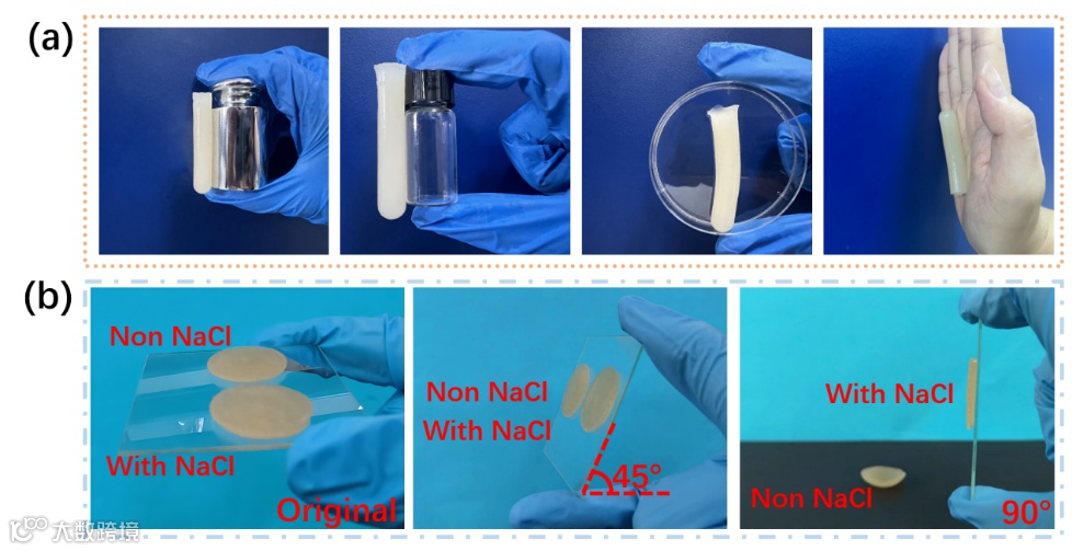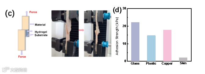 图3. NaCl/SA/PAM/PNIPAM/CaCO3水凝胶黏附性和自愈合性能分析