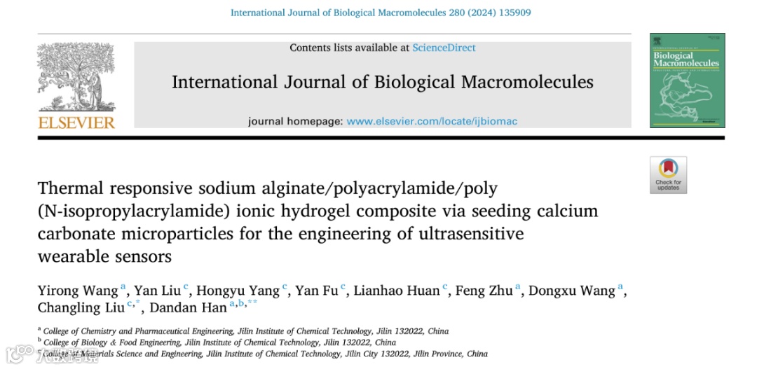 Yirong Wang, Yan Liu, Hongyu Yang, Yan Fu, Lianhao Huan, Feng Zhu, Dongxu Wang, Changling Liu *, Dandan Han **. Thermal responsive sodium alginate/polyacrylamide /poly (N-isopropylacrylamide) ionic hydrogel composite via seeding calcium carbonate microparticles for the engineering of ultrasensitive wearable sensors. International Journal of Biological Macromolecules. 280 (2024) 135909.