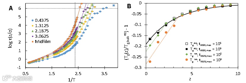 Fig. 2. Simulation results revealing intrinsic nonequilibrium effects on near-surface τ(z) of long-chain films. (A) Segmental relaxation time τ vs. inverse temperature for various segmental layers at different distances z/σ from the surface (σ is the length scale of the bead-spring potential). The dotted lines represent the low-temperature cutoff for inclusion of equilibrium relaxation time data and τ = tANN,max = 106. The curved lines show fits of the data to an established model for equilibrium dynamics. (B) Normalized alteration gradients of Tgeq and Tgne relative to bulk for systems with tANN,max = 105 and 106. The solid line shows a fit of Tgeq (z) to an exponential gradient form to the Tgeq data, while the dotted lines represent linear fits to the surface region.
