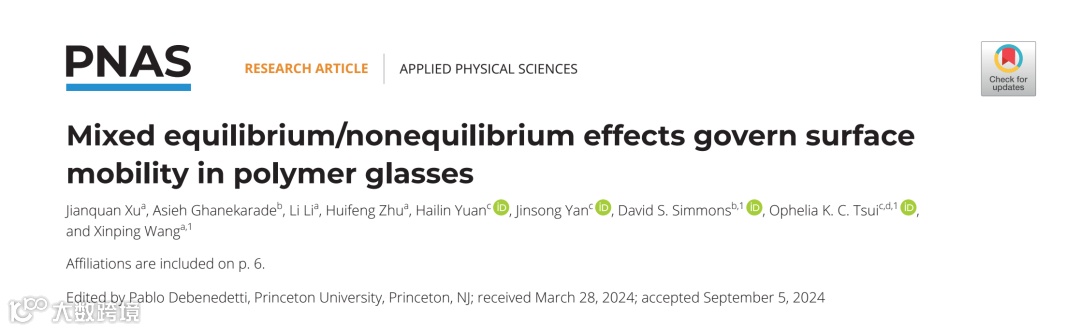 该工作揭示了一种特殊的非平衡效应——内在非平衡效应对表面分子弛豫行为以及表面链段运动能力空间梯度分布的重要影响。利用该非平衡效应可以解释很多原先无法解释的实验现象,并为理解玻璃化的本质提供了新的视角和证据。该成果以“Mixed equilibrium/nonequilibrium effects govern surface mobility in polymer glasses”为名发表于PNAS (PNAS, 2024, 121(41), e2406262121),浙理工化学与化工学院徐健荃特聘副教授为文章第一作者,硕士生李丽为第三作者,David S. Simmons教授, Ophelia K. C. Tsui教授和王新平教授为通讯作者。该工作受到国家自然科学基金的资助和支持,特此感谢。