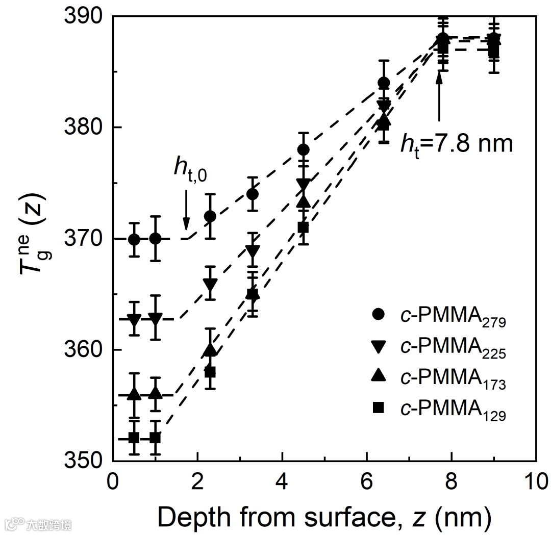 纳米材料表面的分子状态是决定材料表面现象(润湿、摩擦、粘结等)和物理性能(力学、流变、结晶等)的关键因素。研究高分子表面分子的弛豫行为不仅有助于寻找调控纳米材料性能的新方法,还可为揭示玻璃化的本质这一凝聚态物理长期悬而未决的问题提供新的视角和证据。研究发现,玻璃态高分子表面存在一层运动能力增强的“活性层”;随着远离表面,分子运动能力逐渐减弱直至回到本体状态。然而,对于表面增强分子运动能力的传递距离和梯度分布规律的争论,以及实验上高空间分辨率测量表面附近局部分子弛豫时间(或玻璃化转变温度,Tg)的困难,阻碍了该领域的进一步发展。