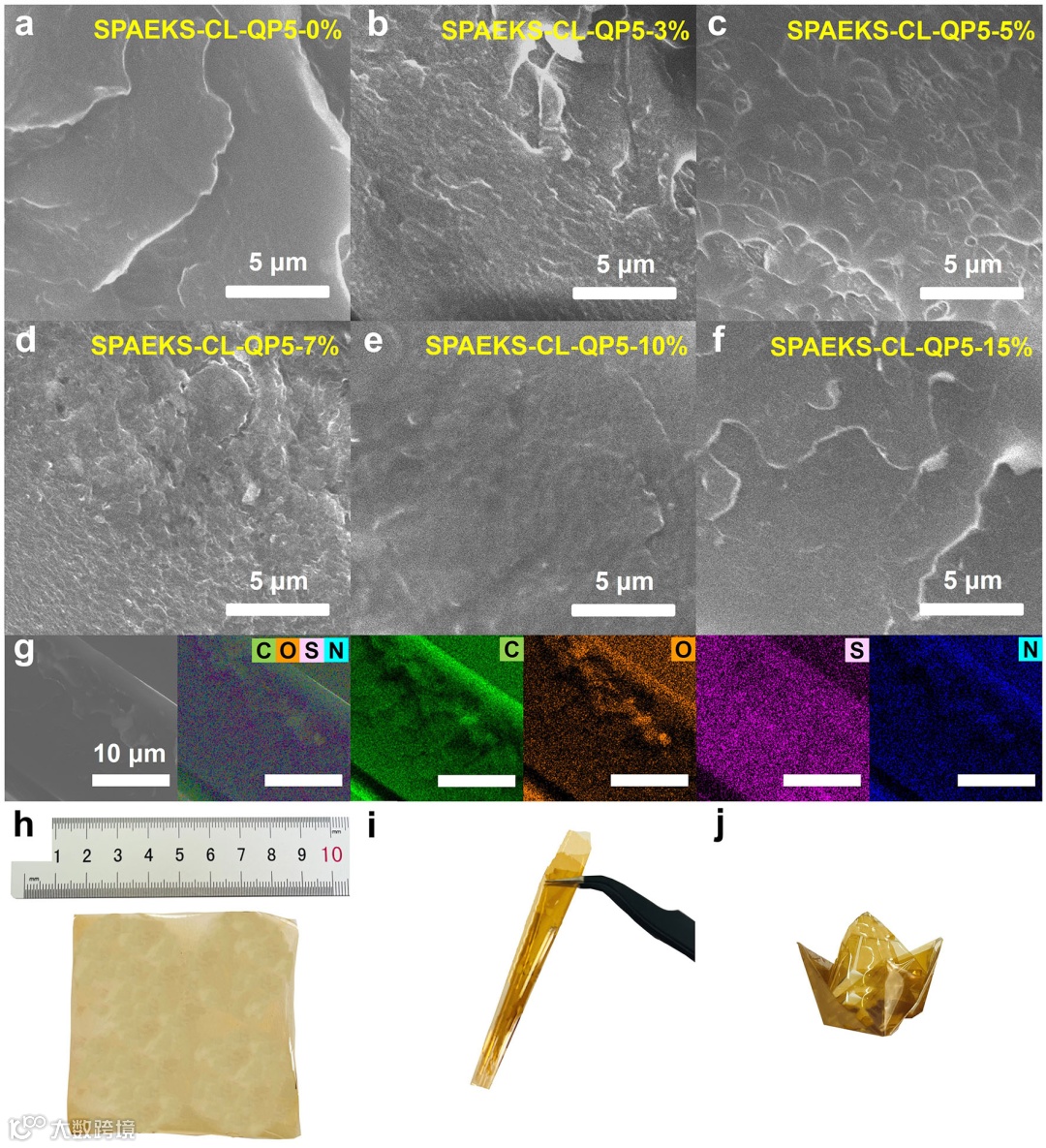 图2. (a–f)SPAEKS-CL-QP5-X%的SEM截面图,(g)SPAEKS-CL-QP5-15%的EDS,(h–j)交联膜SPAEKS-CL-QP5-7%的数码照片