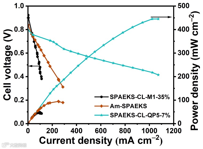 图5. Am-SPAEKS、SPAEKS-CL-M1-35%和SPAEKS-CL-QP5-7%的电池性能