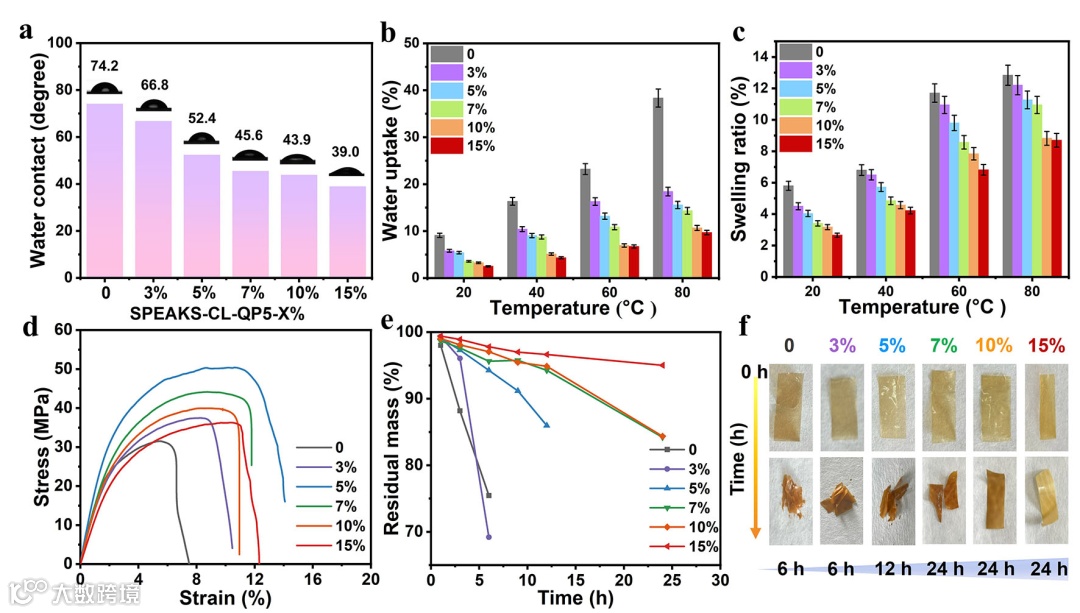图3. SPAEKS-CL-QP5-X%的(a–c)水接触角、吸水率和溶胀率,(d–f)机械性能和氧化稳定性