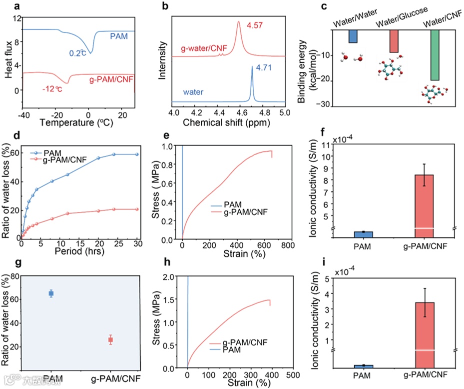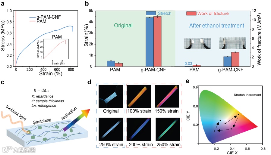 近年来,水凝胶凭借其独特的性能在多个领域备受关注,但其机械强度不足的问题始终是阻碍其广泛应用的一大难题。为解决这一问题,不列颠哥伦比亚大学Feng Jiang团队 (第一作者 Yuhang Ye) 创新性地提出了一种基于糖类材料的多尺度氢键增强策略,通过优化水凝胶的内部网络结构,有效提升其机械性能。这一方法的核心在于引入两种不同尺度的糖类材料——分子级的单糖(如葡萄糖)和纳米/微米级的多糖(如纤维素纳米纤维)。它们能够在水凝胶内部形成跨尺度的氢键网络,大大增强水凝胶的韧性。同时,这种增强的水凝胶还表现出优异的环境耐受能力和抗恶劣溶剂性能,即使在极端条件下也能稳定性能。例如,将水凝胶与乙醇交换后,得到的醇凝胶会因外力作用呈现出独特的鲜艳干涉色,非常适合用来制作力学-光学传感器。同时,这一策略不仅适用于多种材料体系,还展现出广阔的应用前景,比如可以作为生物电子接口用于记录生理信号。这一突破为未来开发更高质量、更耐用的水凝胶提供了新思路,也为可持续生物材料的创新应用开启了新的篇章。
