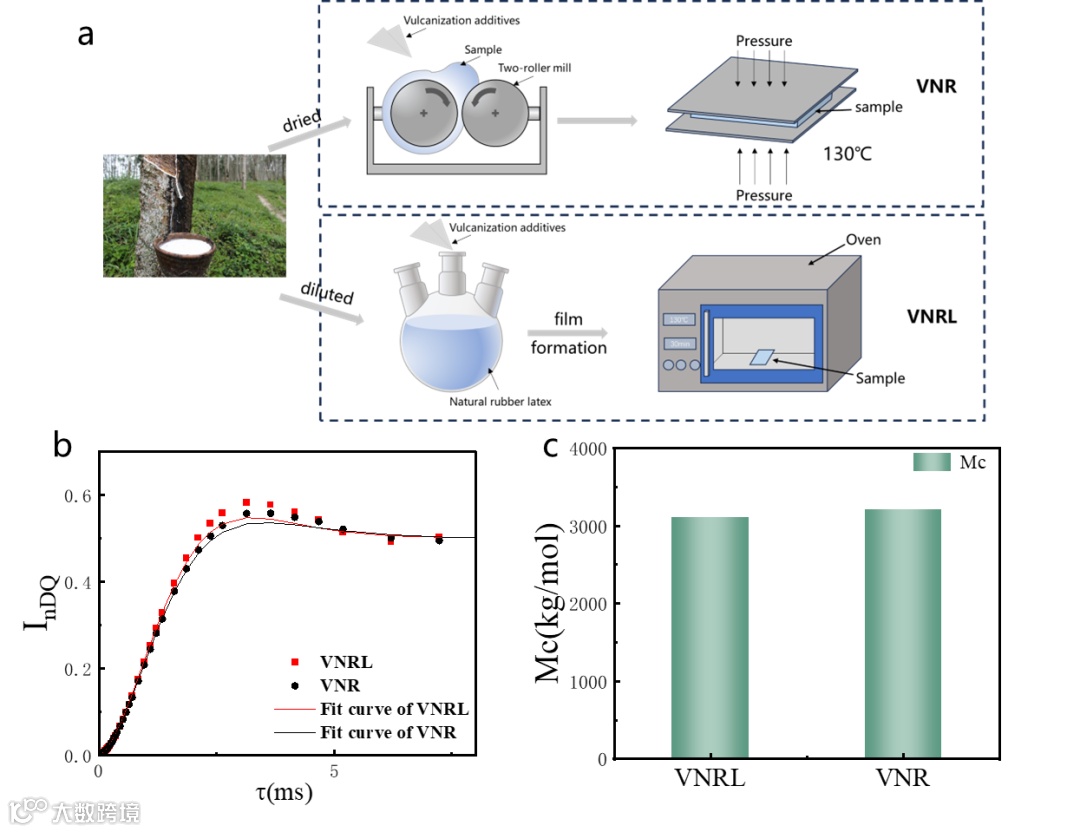 文章所用的VNRL是天然胶乳通过乳液混合加入硫化助剂水分散液,70℃下预硫化1h,130℃下后固化30min制备而成。用于对比的VNR是天然橡胶干胶通过双辊混炼加入硫化助剂,并在130℃下用平板硫化仪热压成型得到。通过调节VNR的硫化配方来控制两者总交联密度(包含永久交联及缠结)一致,并通过双量子固体核磁(DQ-NMR)证明了两者相近的总交联密度,如图1所示。