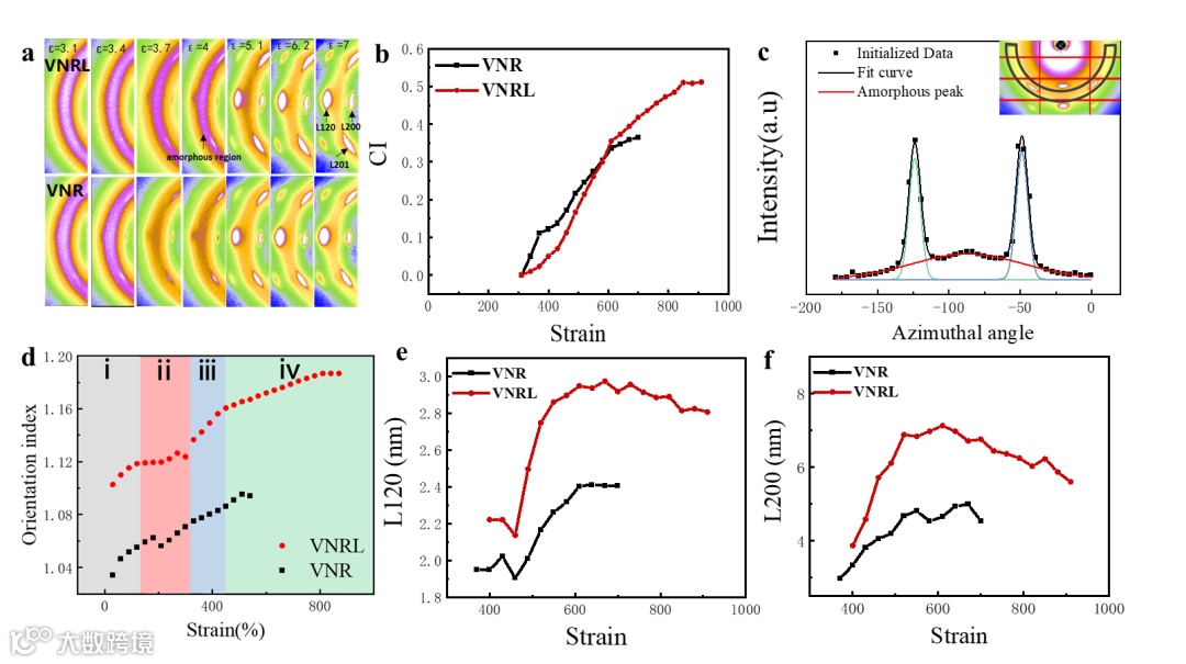 利用同步广角X射线衍射(WAXD)对VNRL和VNR的SIC行为进行了研究,如图5a所示。通过计算得到结晶度指数(CI),如图5b所示。可见,两个样品拥有相近的初始结晶应变,而VNRL的结晶度在初始结晶阶段较小,在大应变下结晶度更高。计算拉伸过程中两者的取向度变化(图5c-5d)。可以看出VNRL的取向行为可以分为四个阶段,而VNR的取向度仅随应变增加,无明显阶段。进一步对两个样品的晶粒尺寸进行计算(图5e-5f),发现VNRL拉伸过程中形成的晶粒尺寸明显更大。