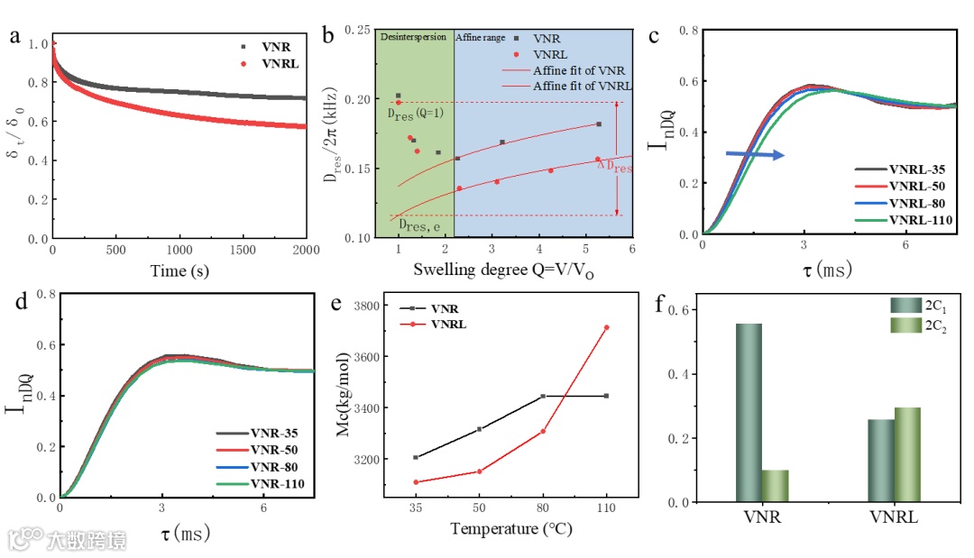 为了研究VNRL的网络结构,采用基于差示扫描量热法(DSC)的热孔隙法对环己烷溶胀的样品进行了分析。如图3a所示,在6℃以下,两个样品之间存在明显差异:环己烷在VNRL中的熔点分布更集中,而在VNR中的熔点分布更分散。这一现象表明VNRL的网络结构比VNR具有更高的均匀性。DQ-NMR对材料结构中残余偶极相互作用参数(Dres)的检测可以反应材料的不同网络结构,Dres的高频分布一般反映材料内部分子链受到的约束作用较强,拥有较紧密的网络结构,Dres的低频分布则反映材料内部分子链受到的约束作用较弱,拥有较为松散的网络结构。如图3b所示,VNRL中观察到的Dres分布更窄,表明其结构更均匀,这与热空隙法的结果一致。