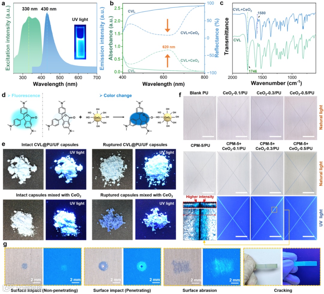 近日,北京科技大学新材料技术研究院张达威和马菱薇教授团队针对上述问题,受见手青损伤变色现象的启发,提出了一种具有显色/荧光双重预警功能,兼具耐老化和主动腐蚀防护性能的涂层体系构筑策略。涂层的多功能性来源于纳米氧化铈(CeO2)颗粒与包覆结晶紫内酯(CVL)的微胶囊的双填料组合体系。微胶囊包覆的CVL作为颜色及荧光指示剂:当涂层发生机械损伤时,微胶囊因机械外力而破裂,释放的CVL在紫外光照射下表现出局部荧光增强,并且其内酯环在CeO2颗粒表面羟基的作用下打开而呈现显著蓝色,实现显色/荧光双重机械损伤预警效果。另一方面,CeO2颗粒的紫外吸收和缓蚀性能也有效地提升了涂层的耐老化和主动腐蚀防护性能。最后,采用电偶腐蚀传感器技术和基于有机光伏器件的透光性测试技术分别监测了所设计涂层的腐蚀、老化失效过程,证实了涂层的主动腐蚀防护和耐老化性能。该研究所设计的填料体系适用于多种成品涂层,为应对防腐涂层的复杂失效形式、延长涂层服役寿命提供了新的解决思路。