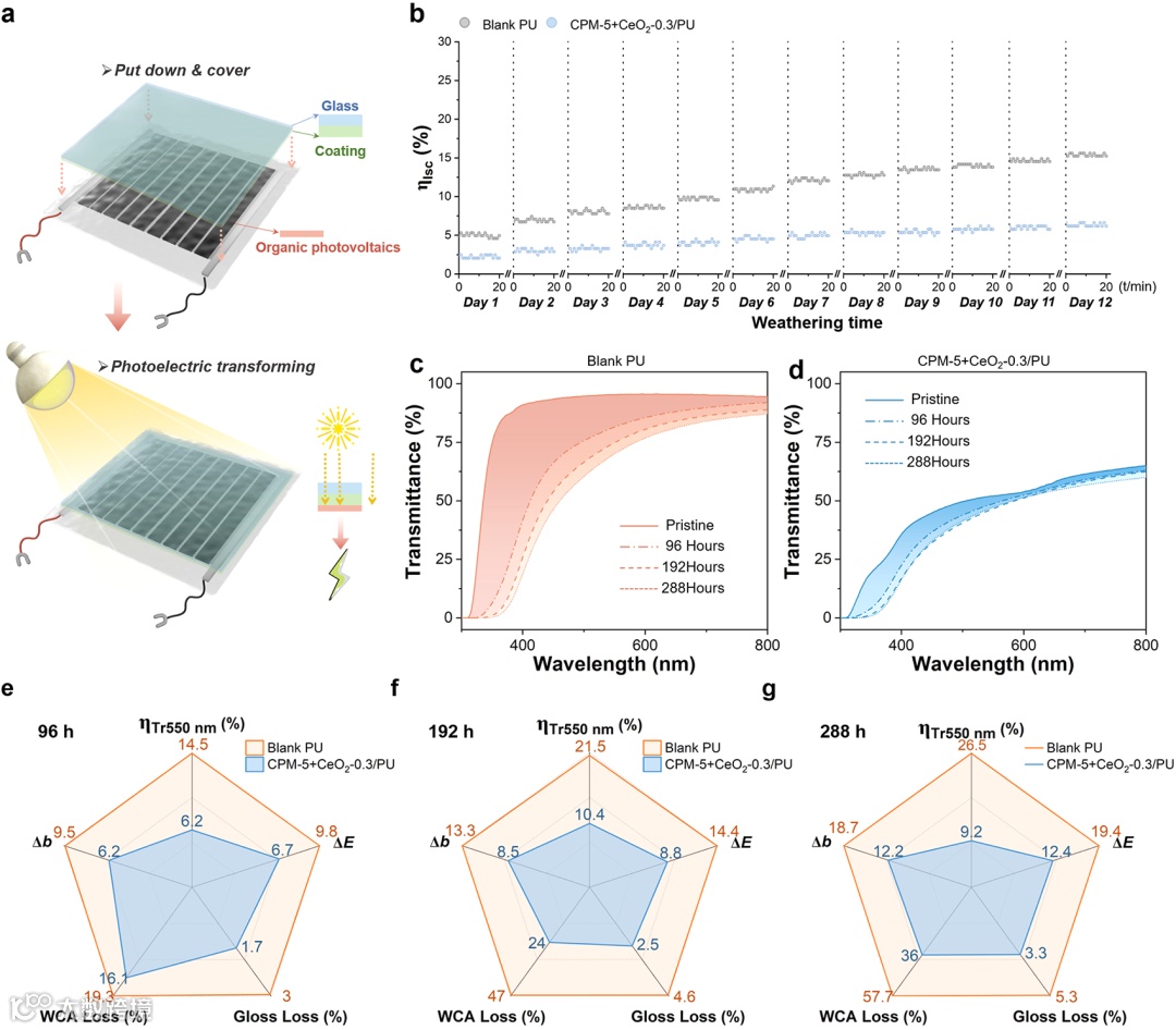 图3 基于有机光伏器件的透光性测试及复合涂层的耐老化性能