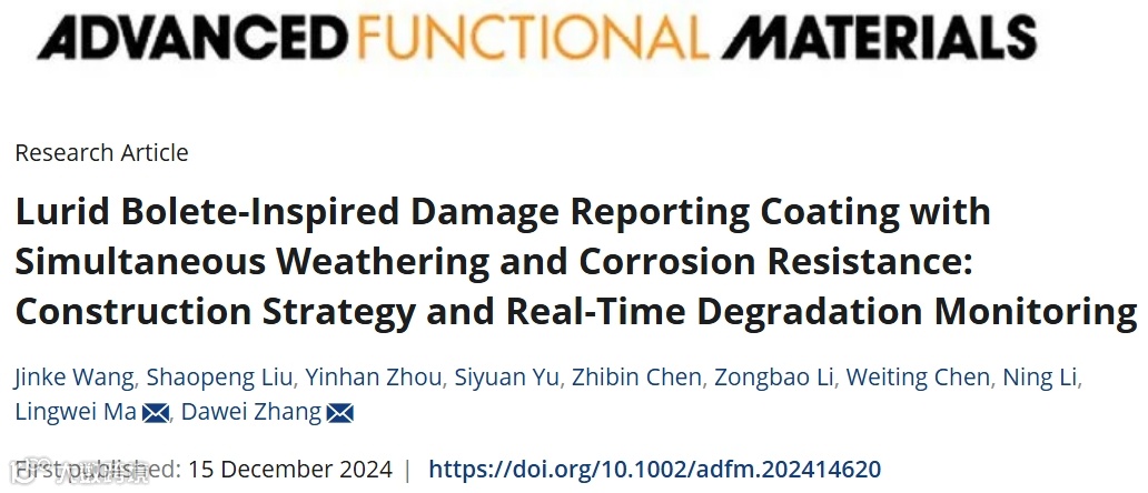 原文信息:Wang J, Liu S, Zhou Y, Yu S, Chen Z, Li Z, Chen W, Li N, Ma L*, Zhang D*. Lurid bolete-inspired damage reporting coating with simultaneous weathering and corrosion resistance: Construction strategy and real-time degradation monitoring. Adv. Funct. Mater. 2024, 2414620.