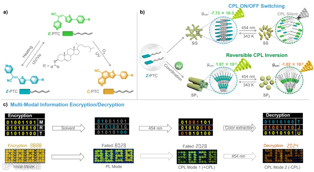 近日,同济大学刘国锋课题组与华东理工大学曲大辉教授合作,成功设计了一种基于吡啶噻唑丙烯腈-胆固醇衍生物(Z-PTC)的光响应分子。通过与银离子(Ag⁺)的配位作用,驱动手性组装,形成了一种能够在光照下调控圆偏振发光(CPL)信号可逆反转和发射颜色切换的超分子组装体。该系统在半固态条件下实现了复杂的信息加密/解密功能,为高级信息加密技术开辟了新的可能性(如图1所示)。该工作以“Reversible Circularly Polarized Luminescence Inversion and Emission Color Switching in Photo-Modulated Supramolecular Polymer for Multi-Modal Information Encryption”为标题在线发表在《Journal of the American Chemical Society》上。该工作得到了国家自然科学基金、东方学者(特聘教授)、上海市科技重大专项、浙江大学上海高等研究院繁星科学基金等项目的资助。