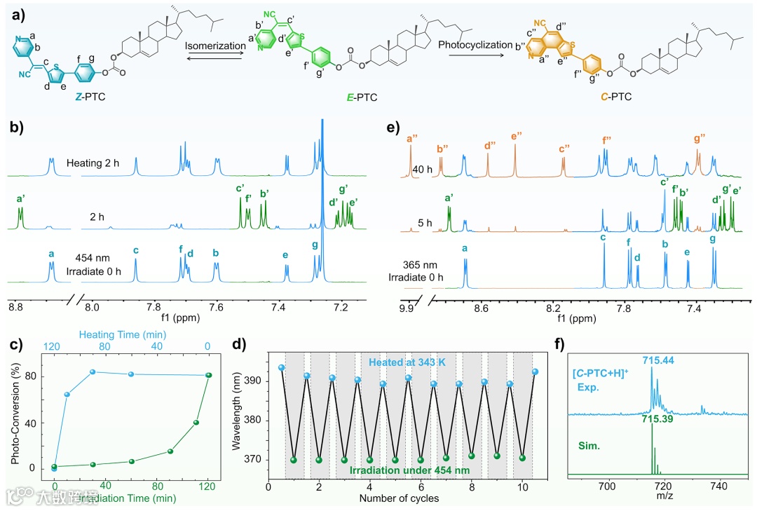 该合作团队首先深入研究了Z-PTC分子溶液中光化学反应路径的波长依赖性及其伴随的光学性质变化。如图2所示,研究人员利用核磁共振(NMR)、紫外-可见吸收光谱(UV-Vis)和质谱(MS)等分析手段,证明了Z-PTC在454纳米光照射及加热条件下能够发生Z/E异构化反应,并且这一过程表现出优异的可逆性和抗疲劳特性。此外,在365纳米紫外光照射下,除了Z/E异构化反应外,Z-PTC还会经历光环化氧化反应,形成环化产物C-PTC。