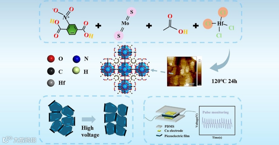 近日,北京石油化工学院师奇松副教授/北京服装学院张文娟教授在《Chemical Engineering Journal》期刊上发表论文“A new theory, Nanoscale Confinement Polarization Pinning effect for enhancing piezoelectricity of PVDF-HFP, to fabricate piezoelectric sensor for exercise assistance”。 该研究通过热溶剂法将金属有机框架UIO-66-NO2 装载到片层MoS2表面,控制Mo金属与Hf金属比例,得到的了不同结构的UIO-66/MoS2 异质结,使用紫外与电化学阻抗(EIS)计算了半导体UIO-66与MoS2的带隙与价带,证明形成了Ⅰ型异质结;将UIO-66,MoS2与异质结加入PVDF-HFP中进行静电纺丝得到压电薄膜;对异质结增强压电效应的机理进行探索,提出Nanoscale Confinement Polarization Pinning (NCPP) theory,拓宽了由多孔类金属有机框架与导体或者半导体构成的异质结在增强压电高分子压电效应领域的应用,并提供理论支持。