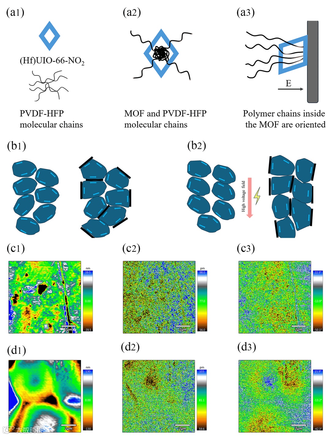 图3 a展示了MOF,二硫化钼,PVDF-HFP分子链三者之间可能存在的相互作用,MOF的多孔结构允许PVDF-HFP分子链渗入MOF内部,当MOF自组装在二硫化钼表面后,内置电场的作用促使MOF内部的分子链取向,同时在极化过程中,二硫化钼相比于MOF更容易受到电场的作用,从而使得PVDF-HFP中电畴取向,进而增强压电性。将异质结加入PVDF-HFP中进行浇筑,如图3c与图3d所示,图3d是加入异质结后的AFM图像,说明异质结的加入有助于促进PVDF-HFP结晶。
