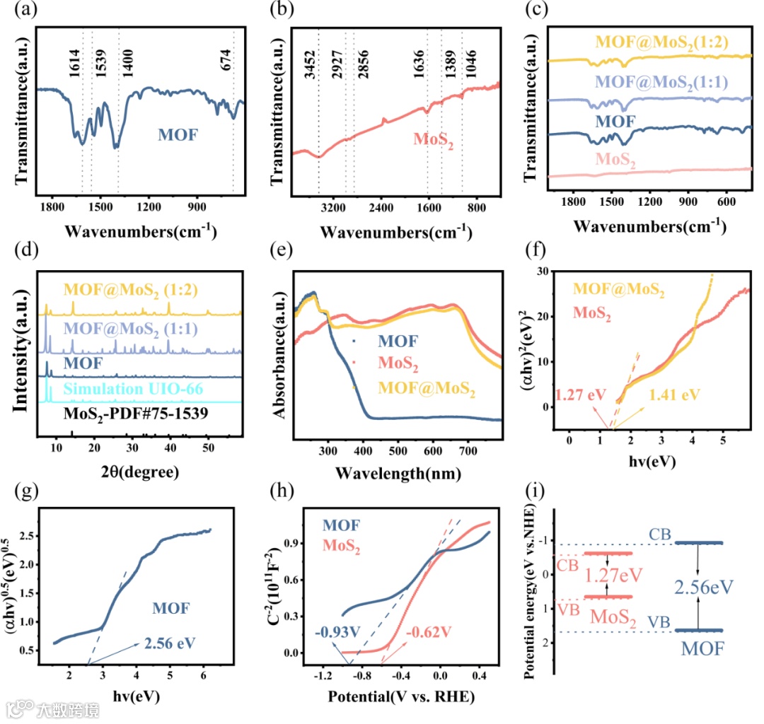 图1. (a)-(c) MOF、MoS2和MOF@MoS2的FTIR光谱,(d) XRD谱图,(e)紫外可见吸收光谱,(f)-(g) Tauc图,(h) Mott-Schottky图,(i)能带示意图。