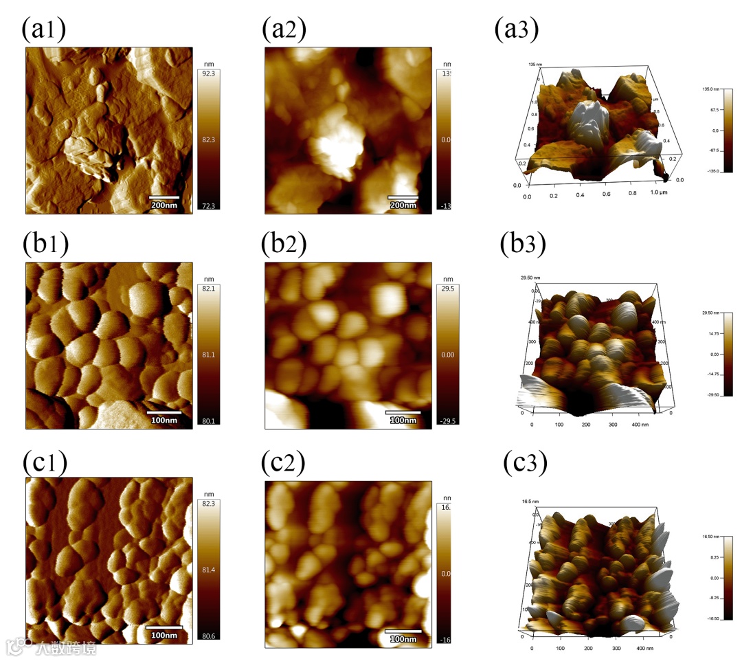 图2. AFM图像(a) MoS2, (b) MOF, (c) MOF@MoS2(1:2)的幅值、高度和三维图像。