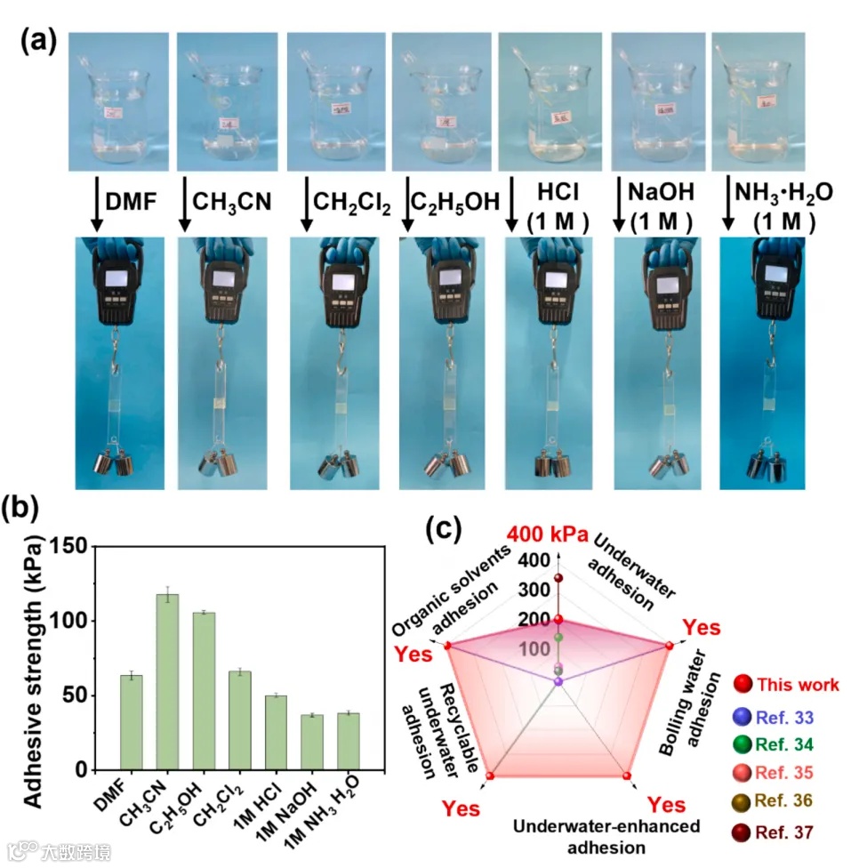 如何使胶黏剂在水中具有较强的粘接强度一直是一个挑战。近期,郑州轻工业大学张晓静团队研究通过以n -乙烯基吡啶烷酮(NVP)为原料,在深共晶溶剂(DES)中一步光引发聚合,合成了一种新型共晶胶。丰富的氢键相互作用和亲水性聚乙烯吡咯烷酮网络结构使共聚物在空气和水下的亲疏水表面都具有良好的粘附性。此外,对于亲水基材,共聚胶粘剂在水下的粘附强度是在空气中的1.3倍,表现出水下增强的粘附效果。相比之下,疏水基材在水下的附着强度低于在空气中的附着强度。即使在沸水、强酸性介质、强碱性介质和有机溶剂中,也能保持较强的附着力。实验和仿真结果揭示了共聚物在水下增强附着力的机理。相信所设计的具有水下粘附能力和高环境适应性的下一代凝胶粘合剂的开发中具有很大的前景。
