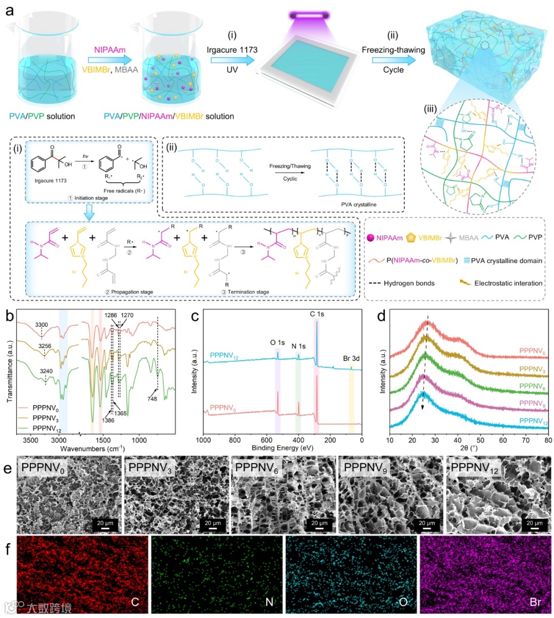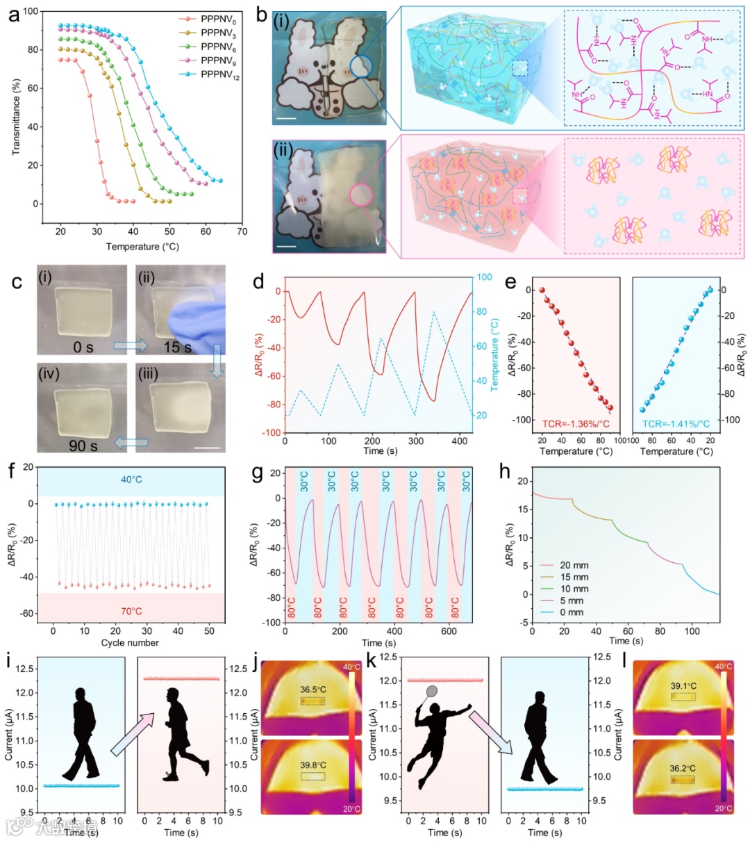 柔性和可拉伸传感器因其在可穿戴设备、人机界面、智能机器人、电子皮肤和实时医疗保健监测等领域的各种应用而引起了人们的极大兴趣。为了进一步满足智能传感设备日益复杂性和多功能性的要求,人们在设计和生产高性能、多功能电子传感材料方面做出了许多努力。其中,离子导电水凝胶具有良好的透明性、可调节的机械性能、更大的传感范围以及更直接的制造过程。此外,生物系统中的信号通常通过离子传输,这使得离子导电水凝胶具有与生物系统相似的灵活性。然而,由于水会在寒冷环境中结冰,传统的离子导电水凝胶通常会失去其原有的性能,包括柔韧性、导电性和光学透明度,严重限制了它们在极端条件下的应用。此外,目前大多数离子导电水凝胶主要集中在应变传感器的应用上,用于检测人体运动,缺乏对温度等刺激的响应性,这使得它们有时无法满足实际应用的要求。例如,皮肤作为人体最大的器官,具有多种功能,如保护功能、感知功能、代谢功能和调节体温的功能等。近年来,为了模拟人体皮肤的多功能感知功能,各种柔性和可拉伸传感器被开发。在各种传感功能中,温度传感对于实时获取皮肤表面、周围环境和植入区域的温度以帮助人类和软人工智能机器人调整后续计划至关重要。因此,能够同时监测人体运动和温度变化的基于应变和温度双响应的柔性水凝胶传感器的开发具有重要意义和使用价值。聚(N-异丙基丙烯酰胺)(PNIPAAm)是一种具有代表性的热敏聚合物,由于其在温度刺激下的快速相变和对温度的可调响应而被广泛用于温度响应性水凝胶。为了满足应用需求,天津工业大学范杰教授、张青松教授和江南大学万爱兰副教授合作制备了一种由离子液体调控的PNIPAAm基离子导电水凝胶,该水凝胶具有应变和温度双响应性,为柔性可穿戴传感器在多功能应用方面提供了思路。