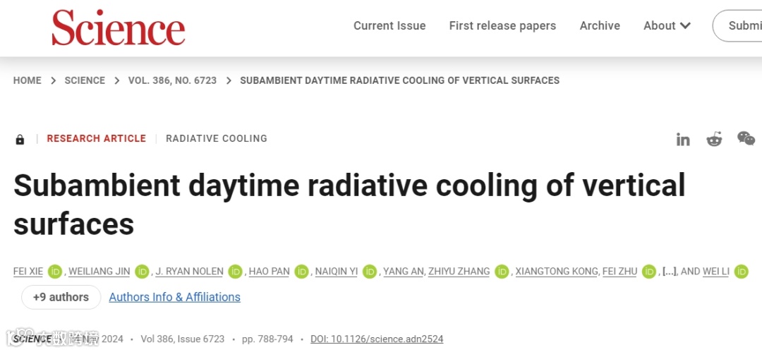 该工作不仅攻克了竖直表面的日间亚环境辐射制冷,对辐射制冷的实际应用具有重大意义;同时突破了热辐射角度、光谱的跨波段协同调控能力,为热光子学操控打开了全新局面。该成果是长春光机所在Science上刊发的首篇第一单位文章,也是李炜研究员及其团队继今年在Nature发表“基于光子学角度/光谱协同调控的高维光场信息感知工作”之后的又一突破性工作。该工作历时4年,得到了国家自然科学基金委创新研究群体项目、重点项目等资助,以及共作者:斯坦福大学范汕洄教授团队,纽约城市大学Andrea Alu教授团队,长春光机所黎大兵研究员团队、张志宇研究员、田思聪研究员,和北京大学肖云峰教授的鼎力支持。