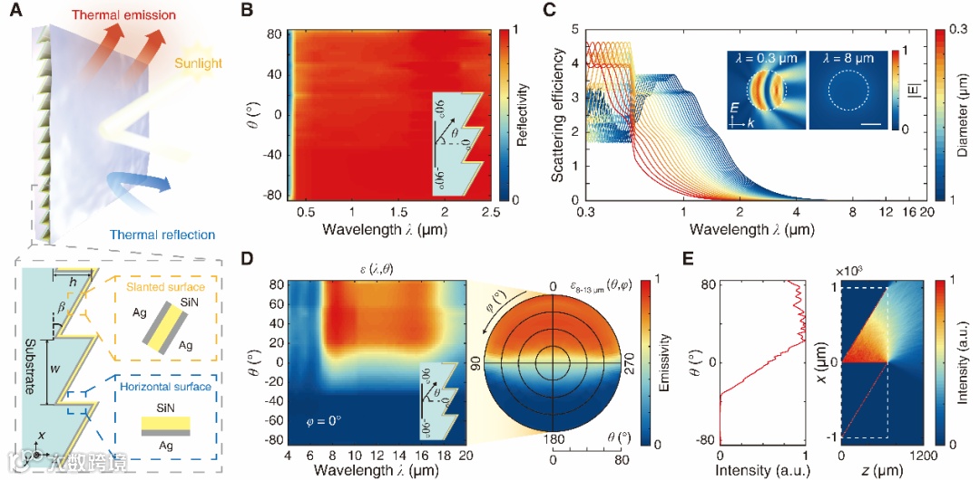 具体来说,首先,研究人员设计了打破镜面对称性的锯齿光栅结构,其倾斜表面最外侧的Ag层可以有效抑制地面发射的热辐射,而其横向表面上的SiN层可以向天空发射光谱选择性热辐射,从而提供角度非对称的热辐射特性。值得注意的是,由于热力学和互易性的限制,锯齿光栅周期必须远大于波长才能实现角度非对称并支持光耦合的准连续频率覆盖。另一方面,锯齿光栅表面的Ag层,可以有效阻挡太阳光进入锯齿光栅内部,从而避免由多次反射造成的太阳光吸收。此外,为了进一步提高发射器在太阳光谱的反射率,一层孔隙尺寸为0.3μm至1μm的多孔聚乙烯薄膜(nanoPE)被覆盖在锯齿结构表面。Ag层和nanoPE薄膜的结合可以在整个太阳光谱范围内产生强烈反射。与此同时,nanoPE薄膜的深度亚波长孔隙尺寸使其在红外波段具有可以忽略不计的散射效率,确保了其较高的红外透射率以及AS发射器的角度非对称光谱选择性辐射特性。