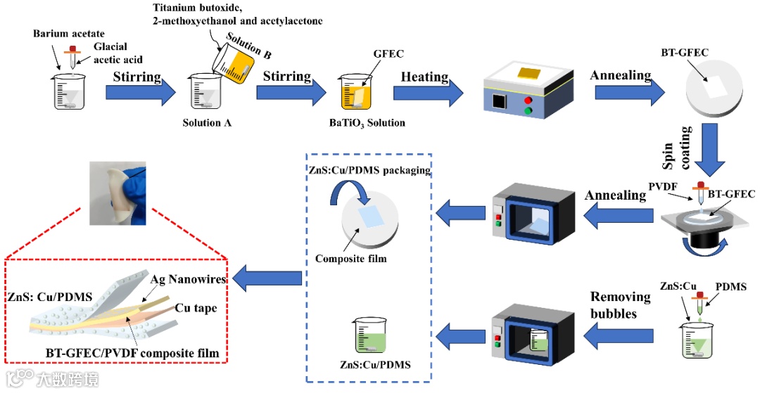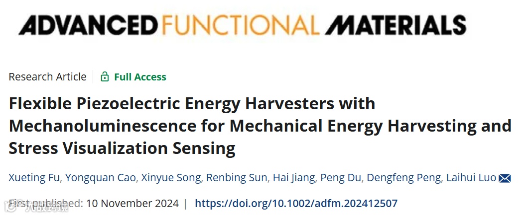 针对这一问题,宁波大学罗来慧教授团队引入应力发光粒子ZnS:Cu制备得到应力发光(ML)层,选择BaTiO3和PVDF沉积在玻璃纤维上得到压电层,通过压电复合膜与ML层结合,制备出具有高性能的ML- FPEH,同时实现了自供电的光-电双模应力传感,弥补了压电传感器只能检测动态应力的固有缺点。这项工作以“Flexible Piezoelectric Energy Harvesters with Mechanoluminescence for Mechanical Energy Harvesting and Stress Visualization Sensing”为题发表在《Advanced Functional Materials》上。