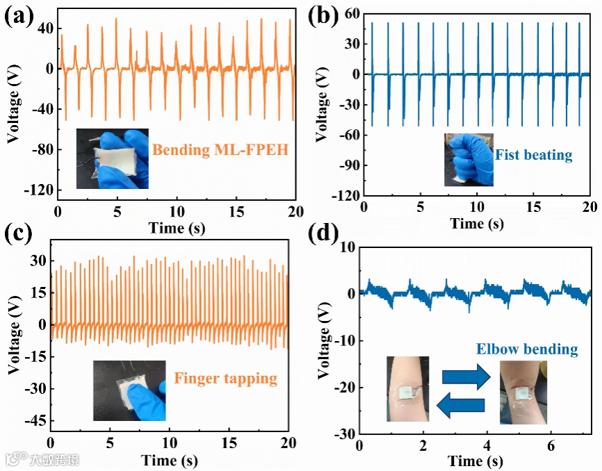 由于ML-FPEH优异的柔性和可适用性,将其固定在人体的不同部位,器件可以从人体运动中有效收集机械能并将其转换为稳定的电输出,实现自供电传感,用于监测人体运动(图4)。