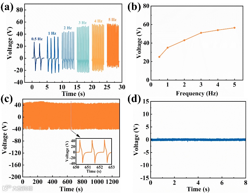 在电学性能方面,在4 N的作用力下,随着频率从0.5 Hz增加到5 Hz,输出电压从25 V增加到58 V(图2 a, b)。考虑到潜在的应用,在频率为1 Hz的周期性压力下测试了ML-FPEH器件的机械耐久性和稳定性。器件的输出性能在超过1000次循环后几乎没有变化,这表明器件具有优异的化学稳定性和机械耐久性(图2 c)。同时测试了不含BT的基于FPEH的PVDF-玻璃纤维布复合膜的输出电压,器件的输出电压几乎为零,这表明ML-FPEH的电输出主要来自BT膜的压电效应(图2d)。