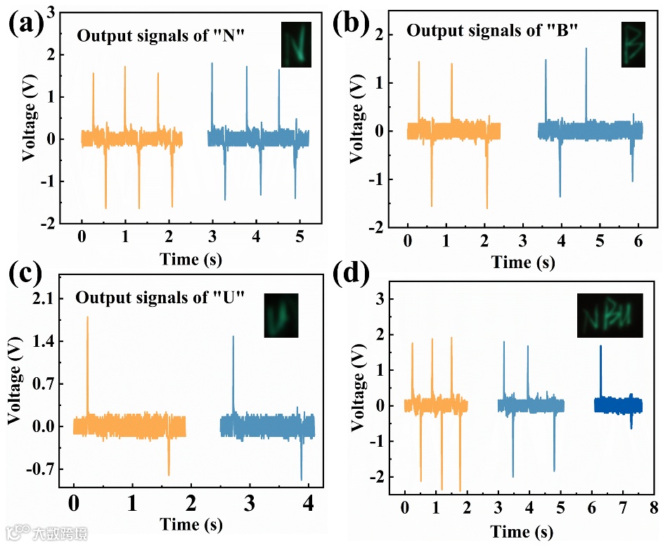 图6 a-d显示了ML-FPNG作为应力传感器通过光-电双模态的应用。当使用笔在ML-FPEH上书写不同的字母时,会有不同的电压信号和视觉图像。施加动态的力可以很明显看到输出电压,但是当施加均匀的力时,没有检测到明显的电压。在整个过程中,肉眼可以清楚地看到绿色ML的强度。单一的电信号不能有效地监测准静态力的变化,而光-电双模态传感器既能提供光信号,又能提供电信号,可以同时对动态力和准静态力进行监测。因此,这种自供电的光-电双模态传感器在多模传感和可穿戴电子皮肤等领域具有广阔的应用前景。