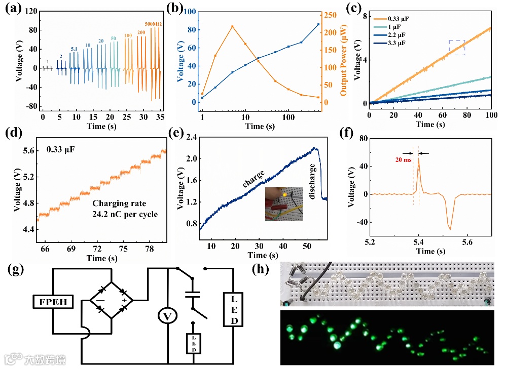 使用1-500 MΩ的外部负载电阻来评估FPEH的输出功率。当外部负载电阻为5 MΩ时,最大输出功率为43.56 μW cm-2 。为了测试器件的充电能力,ML-FPEH连接到桥式整流电路,计算得到平均充电速率为24.2 nC/循环(图3d),这证实了ML-FPEH的高效充电能力。手指轻触ML-FPEH所产生的电能成功用于驱动连接到0.33 μF电容器的商用黄色LED(图3e)。通过用手掌拍打ML-FPEH,无需任何外部存储系统即可轻松地同时点亮27个商用绿色LED(图3h),以上应用可以有力地证明ML-FPEH出色的能量收集能力。同时,对ML-FPEH的响应速度进行了评价。当手指按下时,响应时间仅为20 ms(图3f)。可以看出,ML-FPEH响应快速,具有作为自供电传感器的潜在应用。