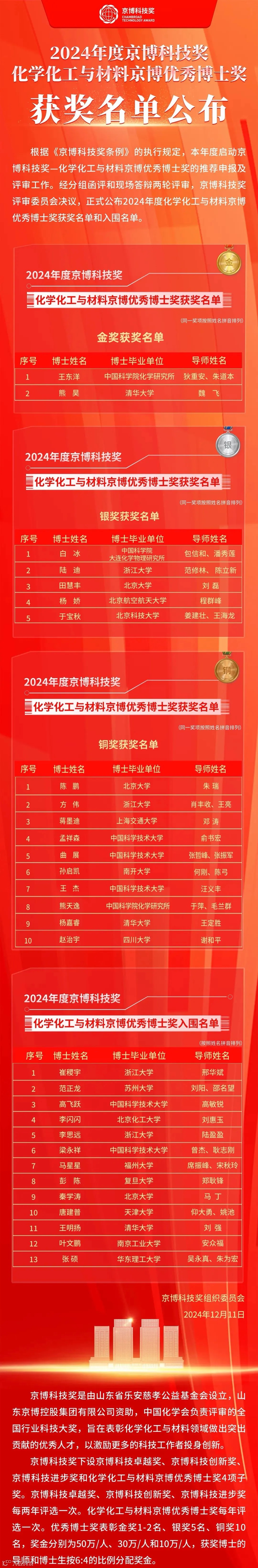 2024年度京博科技奖 - 化学化工与材料优秀博士奖拟获奖名单公示