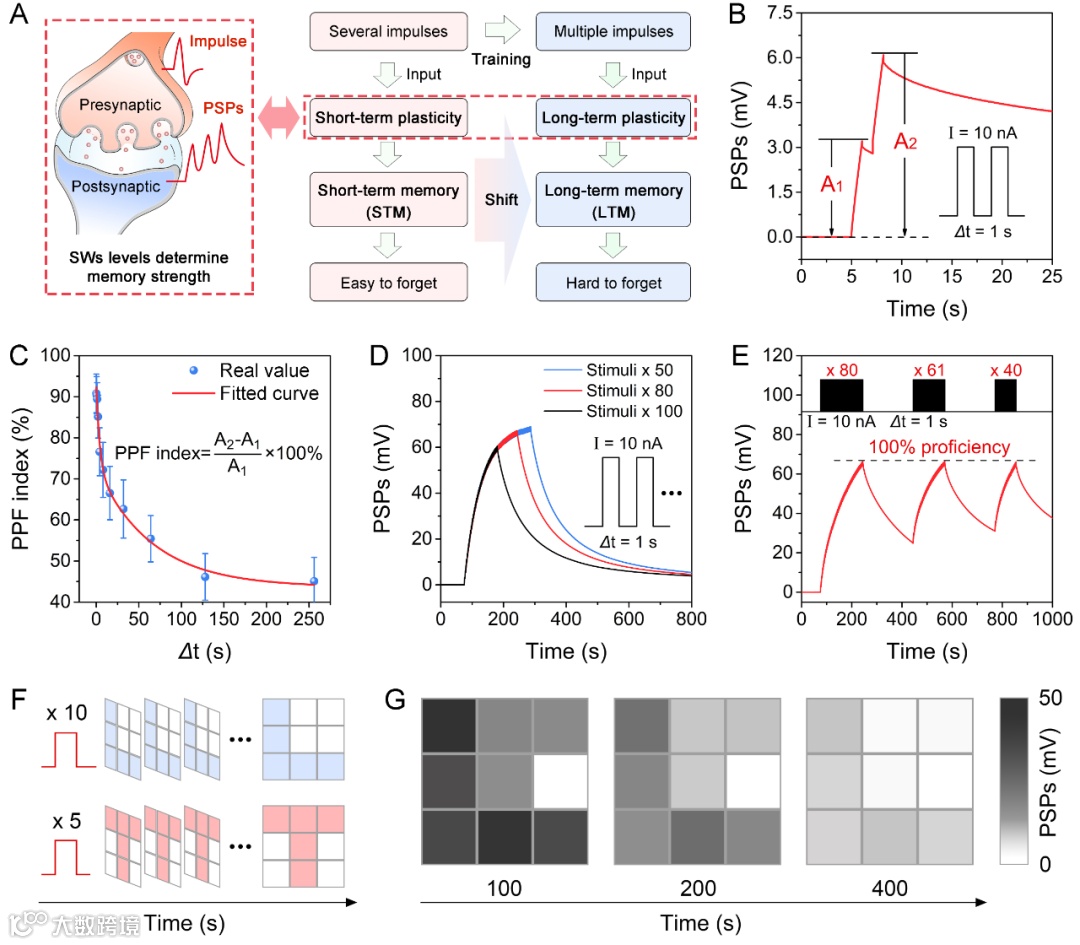 图3. 电流刺激诱导的突触可塑性用于模拟学习和记忆。(A)大脑记忆的生物学基础。(B)模拟PPF效应。(C)PPF指数与脉冲间隔的函数关系。(D)模拟LTP效应。(E)模拟经验学习。(F)实现图像存储和加密功能。