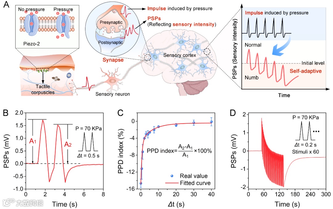 图2. 压力刺激诱导的突触可塑性用于模拟触觉感知。(A)皮肤的触觉感知原理。(B)模拟PPD效应。(C)PPD指数与脉冲间隔的函数关系。(D)模拟LTD效应。